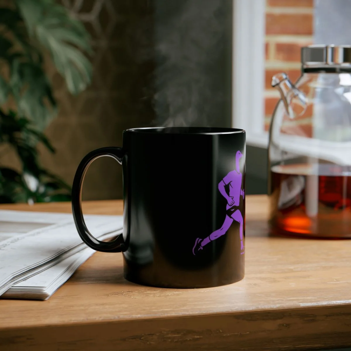 Running Nostril goose graphic Mug | purple runner illustration on black ceramic