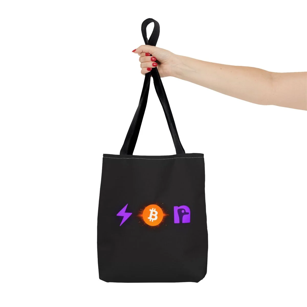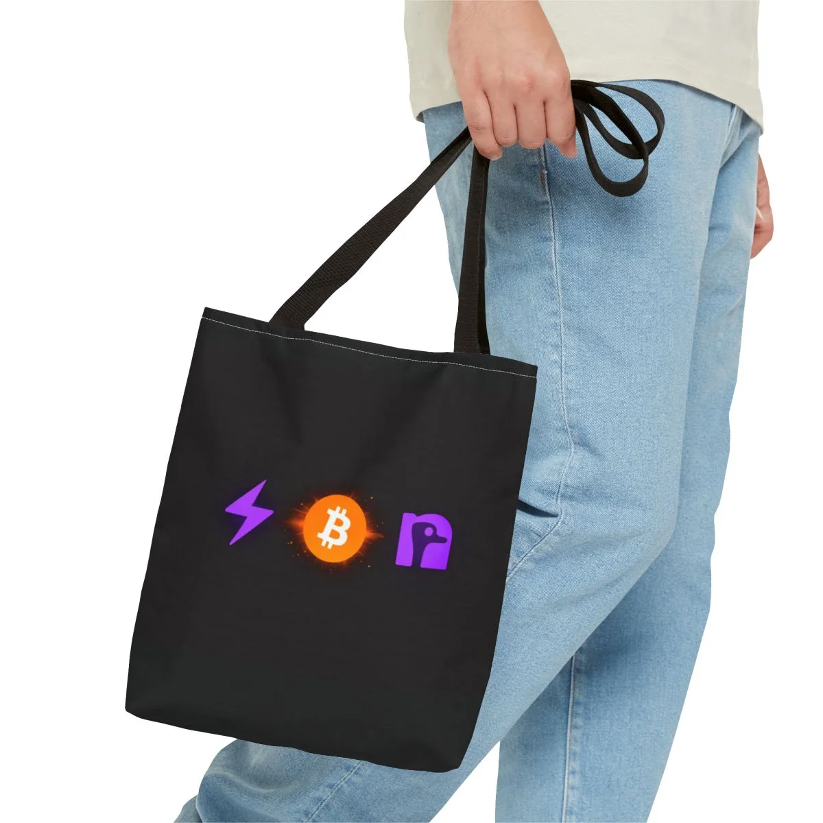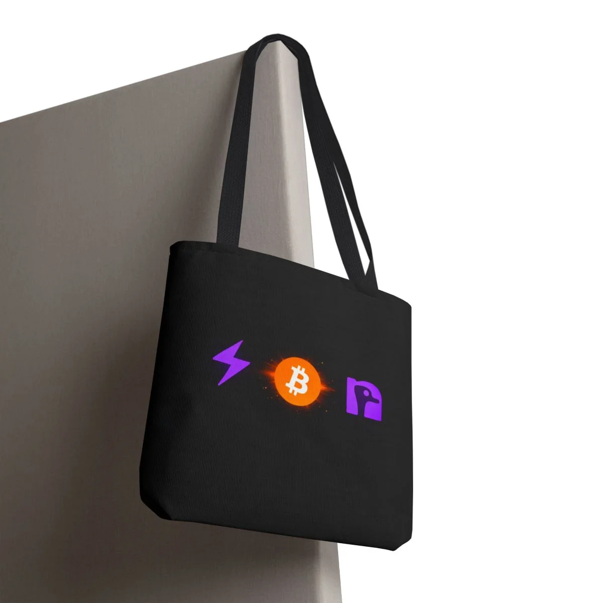 Carry a spark of crypto-culture everywhere you go. This roomy tote pairs a sleek black canvas with a bold, neon-inspired trio of icons — a lightning bolt, a glowing Bitcoin emblem, and a stylized lock — that read like a modern shorthand for fast, secure value. It feels light on the shoulder but stur...